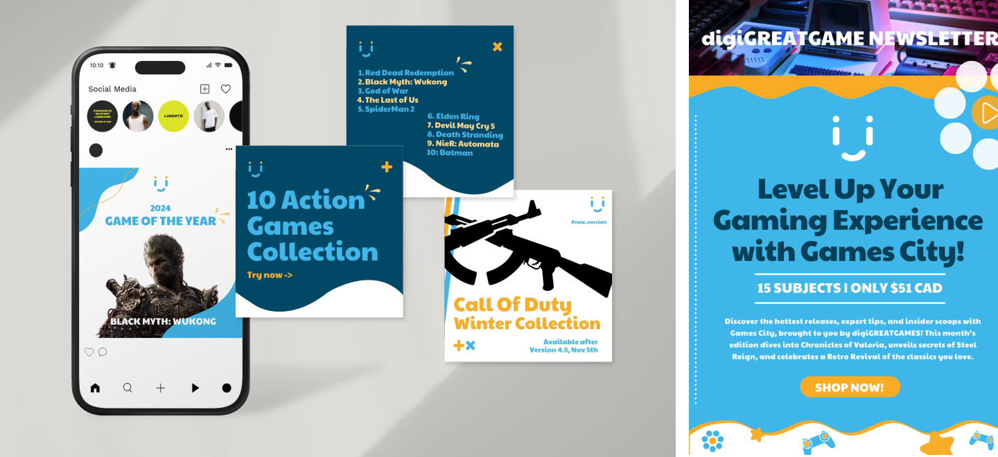 DigiGREATGAME helps game developers build strong communities and create engaging player experiences. This project develops a cohesive brand identity, app design, and awareness campaign that communicates the studio’s approachability, creativity, and focus on community, making it recognizable and trusted across digital and physical touchpoints.