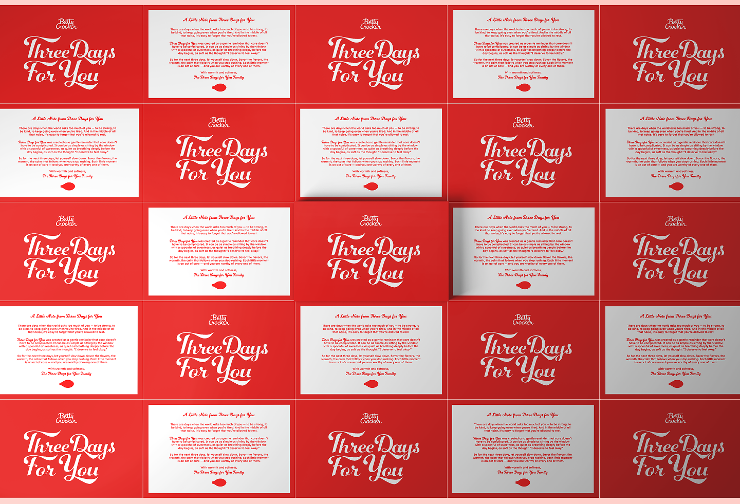 “Three Days For You” repositions Betty Crocker through a design system that blends emotional storytelling with modern self-care aesthetics. I developed a cohesive visual language from packaging to campaign materials that softens the brand’s image, introduces a new product line, and connects with younger audiences through warmth, simplicity, and quiet intimacy.